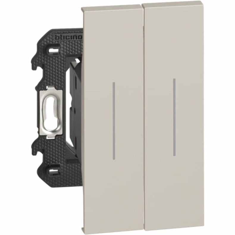 Выключатель двойной с подсветкой белого цвета нажимной 2 модуля немецкий стандарт клеммы автомат. Цвет песочный. Bticino Living Now